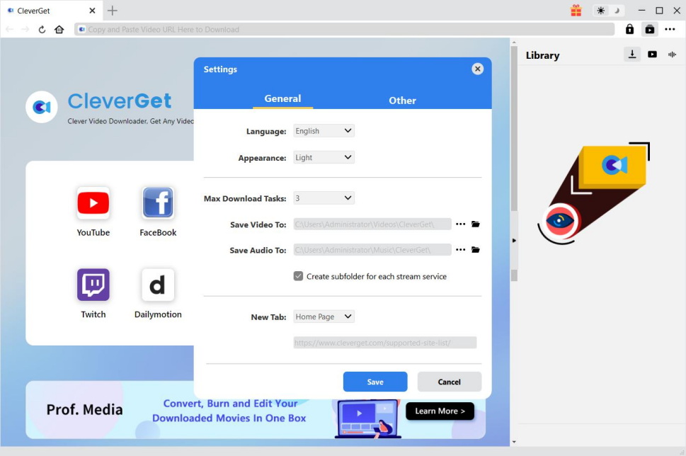 Before you start downloading Spanish-dubbed anime online, you can set the output directory first. Click the three-dots icon and then choose the “Settings” option to pop up a detailed settings panel. After you have the settings done, Click the “Save” button.