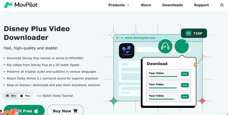 MovPilot is also a solid Disney Plus video downloader you should try, which allows you to download movies to MP4/MKV in HD720p with ultra-fast speeds. Plus the Dolby 5.1 surround sound and audio description, the Disney+ downloader lets you save videos without the best output quality. You can also retain audio as well as subtitles of the original language.