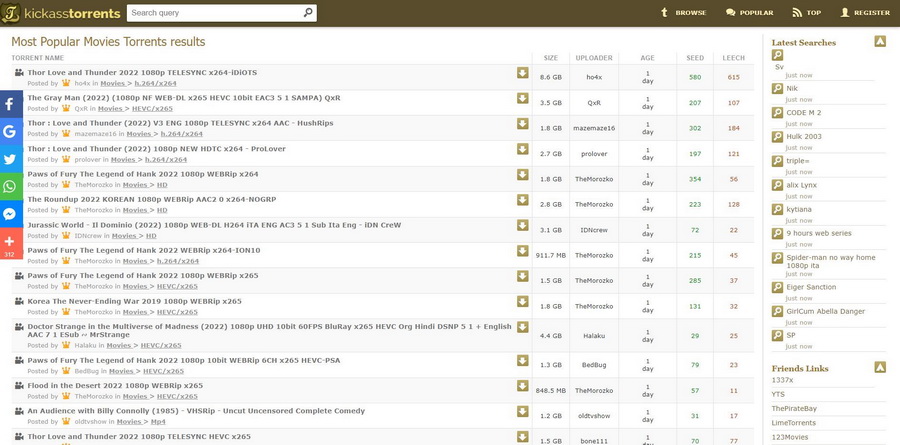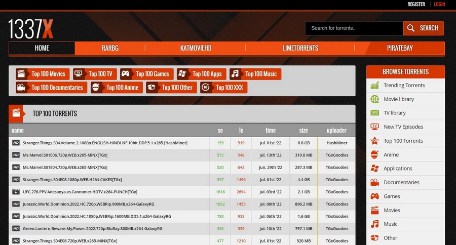 As another best torrent site for movies and TV shows, 1337X is one of the most active torrent sites today. It provides a directory of torrent files and magnet links used for peer-to-peer file sharing through the BitTorrent protocol. On this site, though annoying ads is inevitable, you can download movies in high quality up to 4K. You can get movies from all genres and TV shows of all varieties.