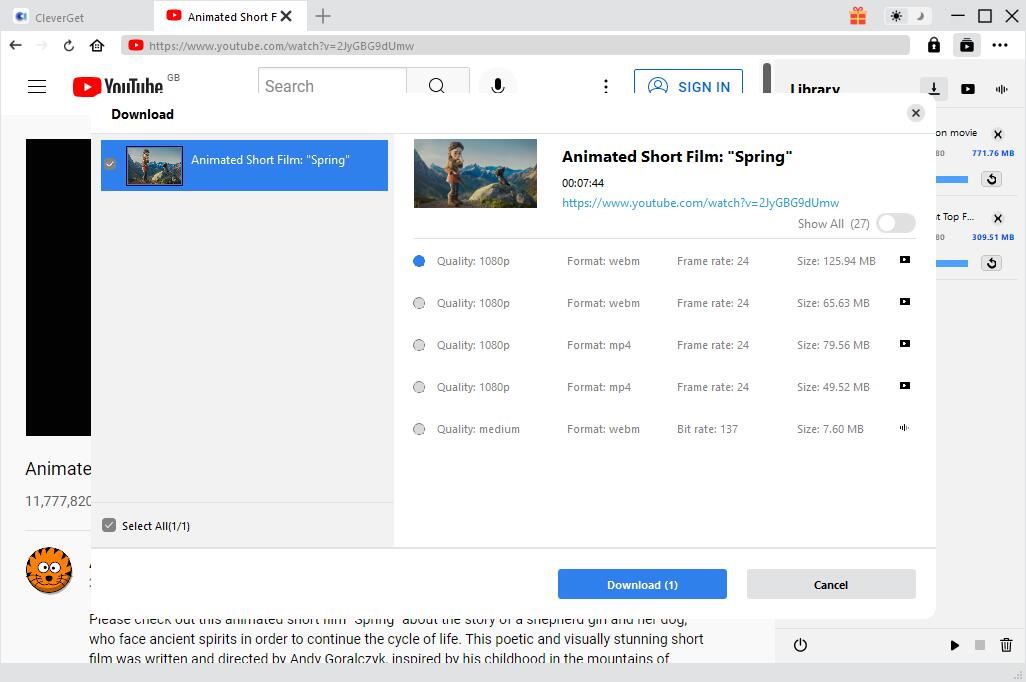 Copy and paste the URL of the target movie in the address bar and tap “Enter”. CleverGet will play the movie and detect available sources to download. Downloadable movie options are listed in different formats, sizes and resolutions on the Download panel. Select desired option(s) and then click “Download”.