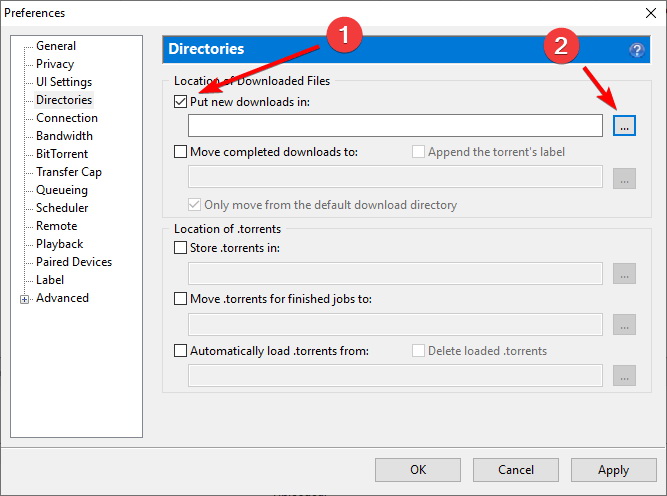 Launch uTorrent. You can specify the output directory to save your downloaded movies before downloading. You can choose “Options” > “Preferences” > “Directories”, then you can tick “Put new downloads in” and select an output file folder for saving the movies you are going to download. Finally click “Apply”.