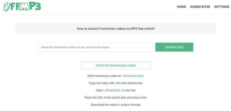 Offmp3 is a useful Funimation downloader online tool that can help you download anime episodes on Funimation. The Funimation downloader allows you to save videos to MP4 with HD-quality output, with no software installation needed. There is no need to sign up for anything, just input the Funimation video link and you are ready to save it for free.