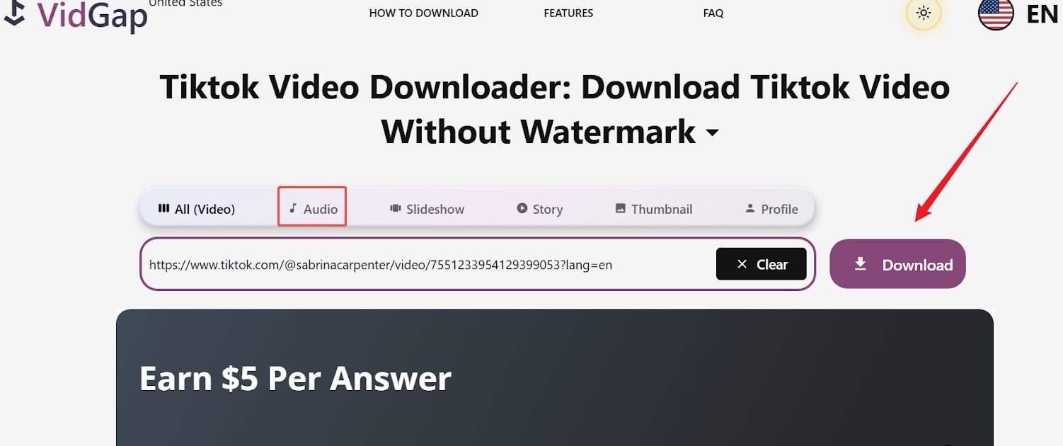 Step 2: Then go to the converter website VidGap, choose the Audio option.