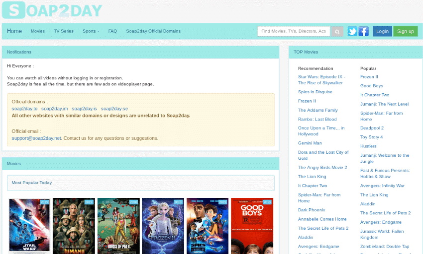 Soap2Day is a popular website for watching movies and TV shows without the need to register an account or worry about annoying pop-up ads. It is the only one among the above websites that doesn’t emphasize only movies and TV series given its menu link to sports shows such as the NBA Playoffs and Fifa World Cup. Though it was down before, you still can access its new sites now.