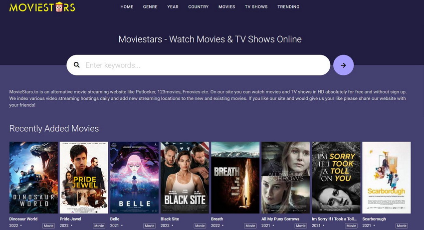 Considered as one of the best free movie streaming websites, Moviestars has a huge collection of Hollywood movies and TV series. You can watch the latest movies on this site in HD on your PC, tablet or mobile phone. It is absolutely for free without sign up but with pop-up ads.
