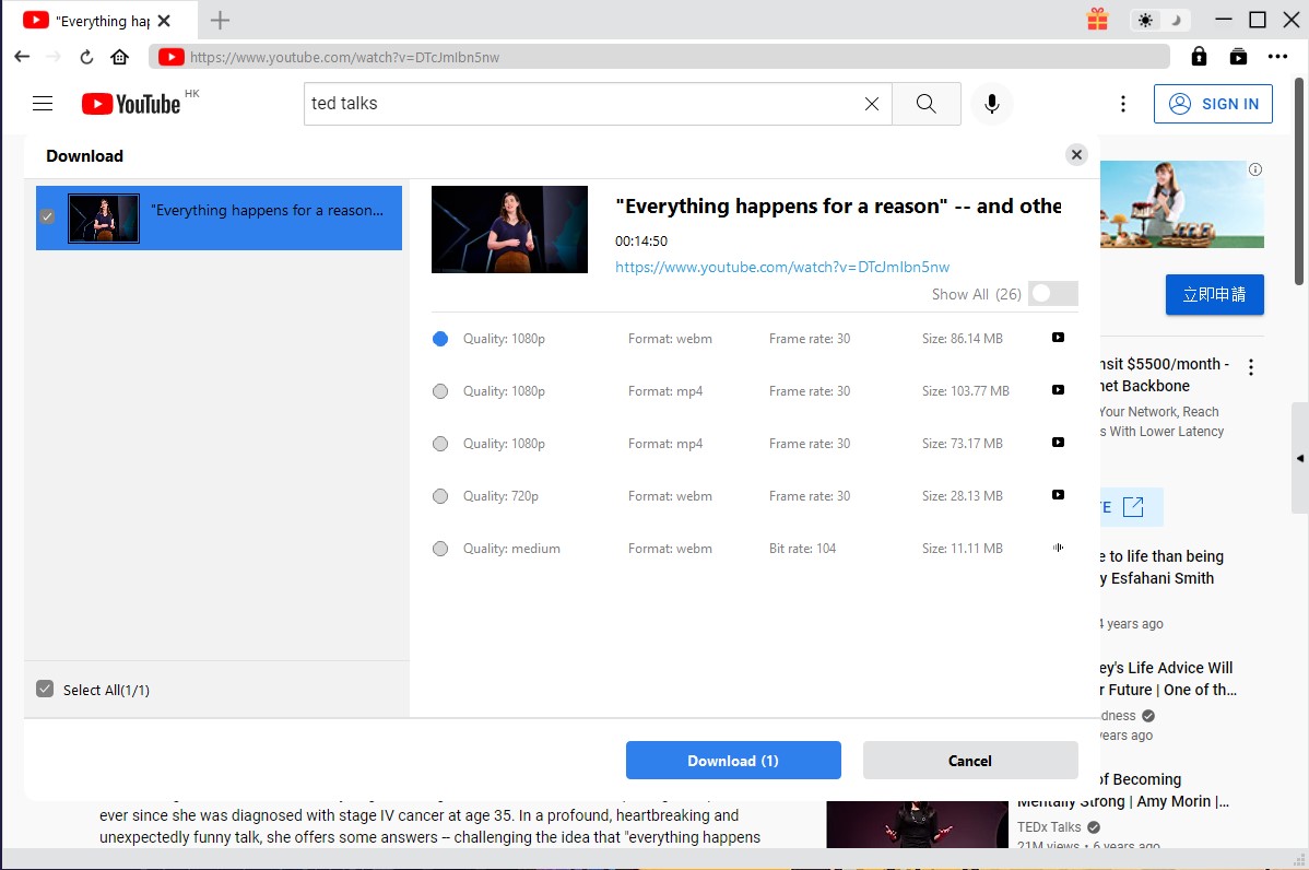 After accessing the Ted Talks video on YouTube, CleverGet Video Downloader will automatically identify the memory size, format, resolution, etc. of the downloadable Ted Talks video on the page, and then display it to the user. Users can download videos according to their needs. By clicking the “Download” button, CleverGet Video Downloader can be instructed to download the video.