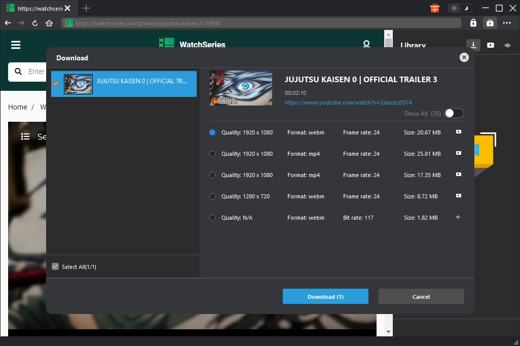 There will pop out a “Download” interface that provides all available video and audio download options of target video for you to choose after the program has completed the analyzing. You need then to choose the proper download option by referring to the video quality, resolution, format, size, and frame rate. Then, click the “Download” button. The number on the “Download” button indicates how many videos/audios you have chosen and would like to download.
