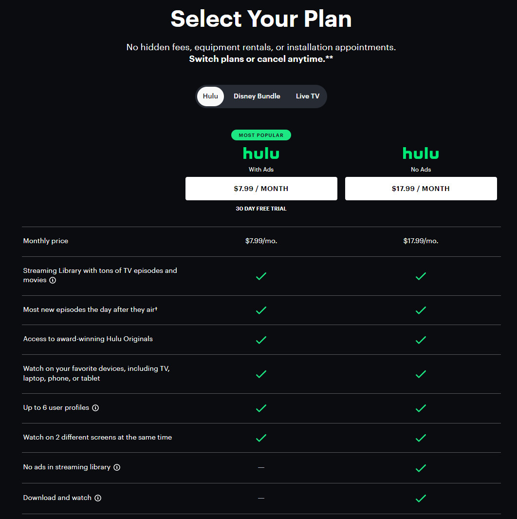 Hulu offers various subscription plans for various needs. The basic Hulu subscription plan is Hulu with ads, which starts from $7.99 per month. You could also spend even less if you are a student since Hulu offers a student plan at $1.99 per month only. Keep in mind to disable auto-renewal of the subscription.