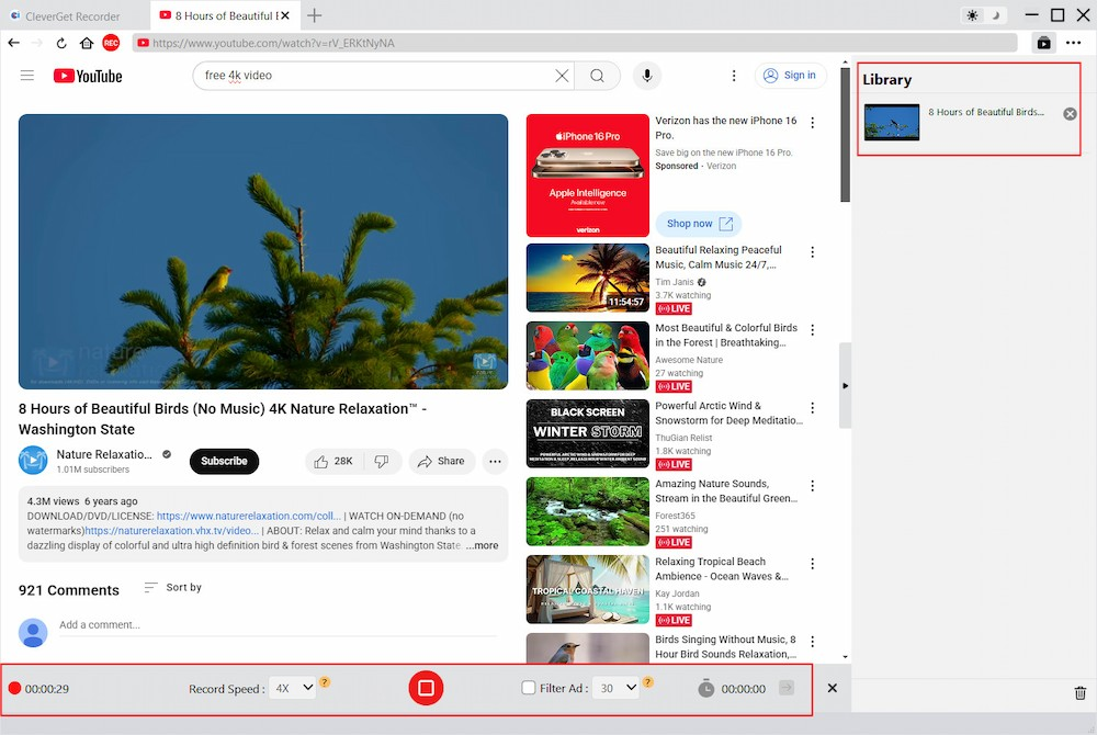 Finally, tap the red REC button to begin recording. CleverGet will capture the video and its embedded audio in real time. Once recording is done, click Stop, and your recording will be saved automatically in your chosen format. In the right side library, you can find your recorder videos.