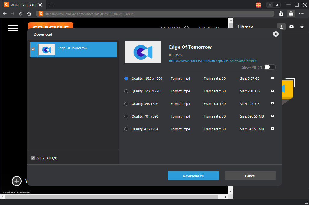 If CleverGet detects downloadable options, it will pop up a “Download” window with diverse downloadable options listed in different resolutions, formats, frame rates and sizes. Choose the one you want to download and then click the blue “Download” button at the bottom to start downloading. It allows multiple choices. You could open multiple Crackle video pages to let CleverGet Crackle Downloader to parse and download multiple Crackle videos at the same time.