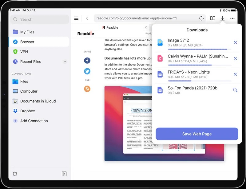 Documents is one of the most popular file management apps for iOS, but it also works well as a file downloader, thanks to its native support for a wide range of file types for both viewing and downloading. You can organize, save, and browse your files without needing to export them to another program because it’s a full-featured file management app.