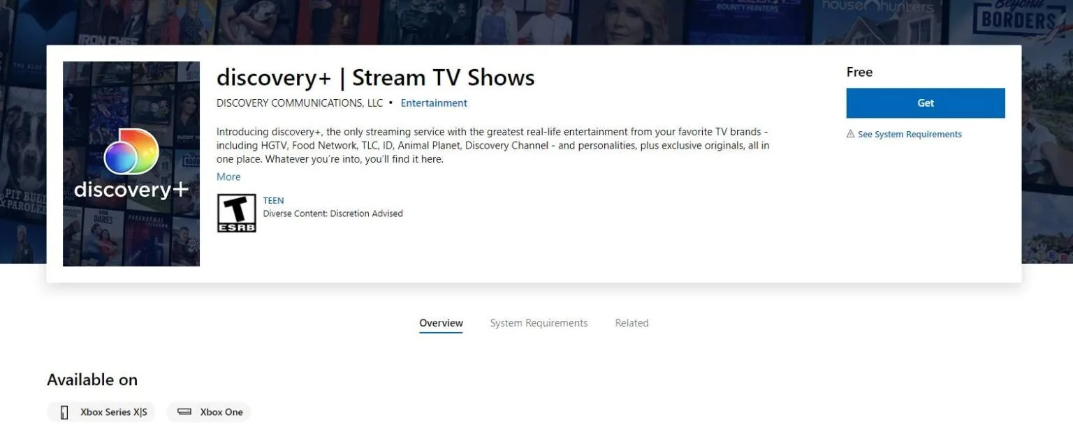Step 3: Highlight the app in the search results. Hit the “Get” button to download the Discovery Plus app on Xbox One.