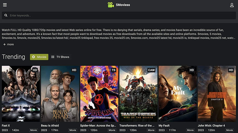 5Movies is another Emovies alternative that lets you stream movies and TV shows for free. You can find fresh cinema releases with cam versions if you don’t mind the video quality. The site supports subtitles in multiple languages, and you can also download movies for free.