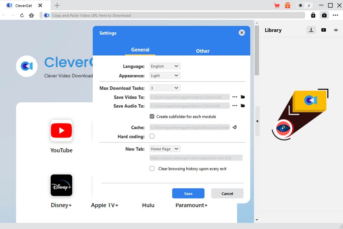 Launch CleverGet and you can change the default settings based on your needs before downloading. Click the three-dots icon and “Settings” to open the Settings panel where you can change the output folder in the “Save Video To” box as well as other settings like program UI language, appearance, max download tasks, etc. Click “Save” button to complete.