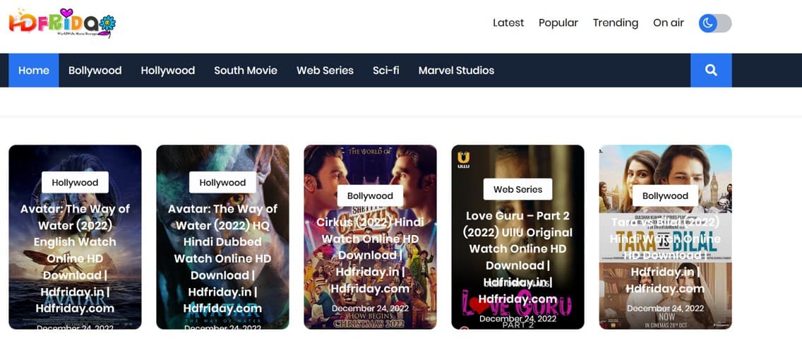 HDFriday offers you the chance to watch Bollywood, Punjabi, South Hindi Dubbed, Hollywood movies and more online without sign in. If you are a fan of Hindi movies, this website is quite suitable for you to navigate. This website enables you to download movies easily and quickly.