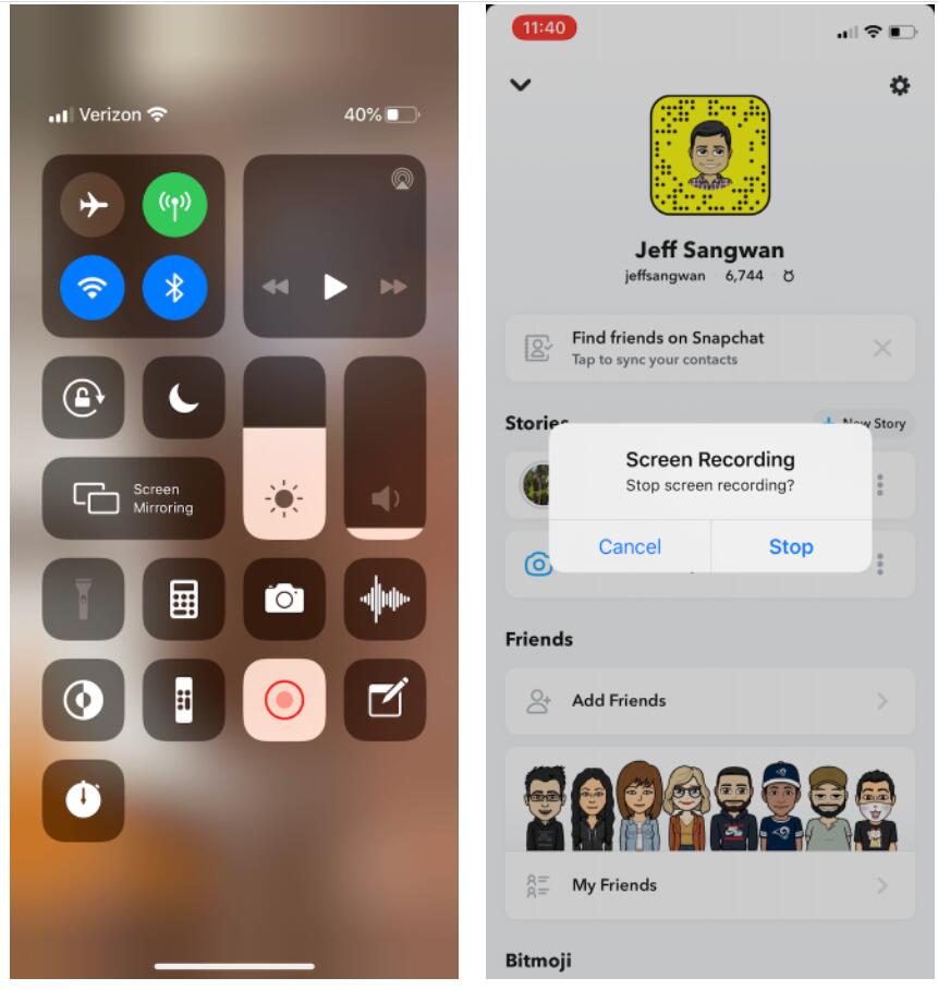 Step 2: Tap the Screen Record button, then swipe up on the Control Center instantly to go back to Snapchat.