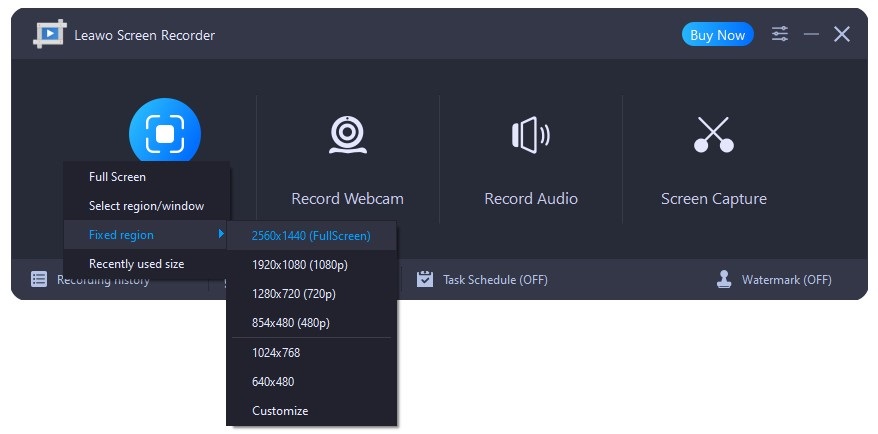 To record Snapchat video, you can choose Record Screen on the main interface. Then, a drop-down menu will pop up to show different options for recording region. And you can select from “Full Screen”, “Select region/window”, “Fixed region”, or “Recently used size”.