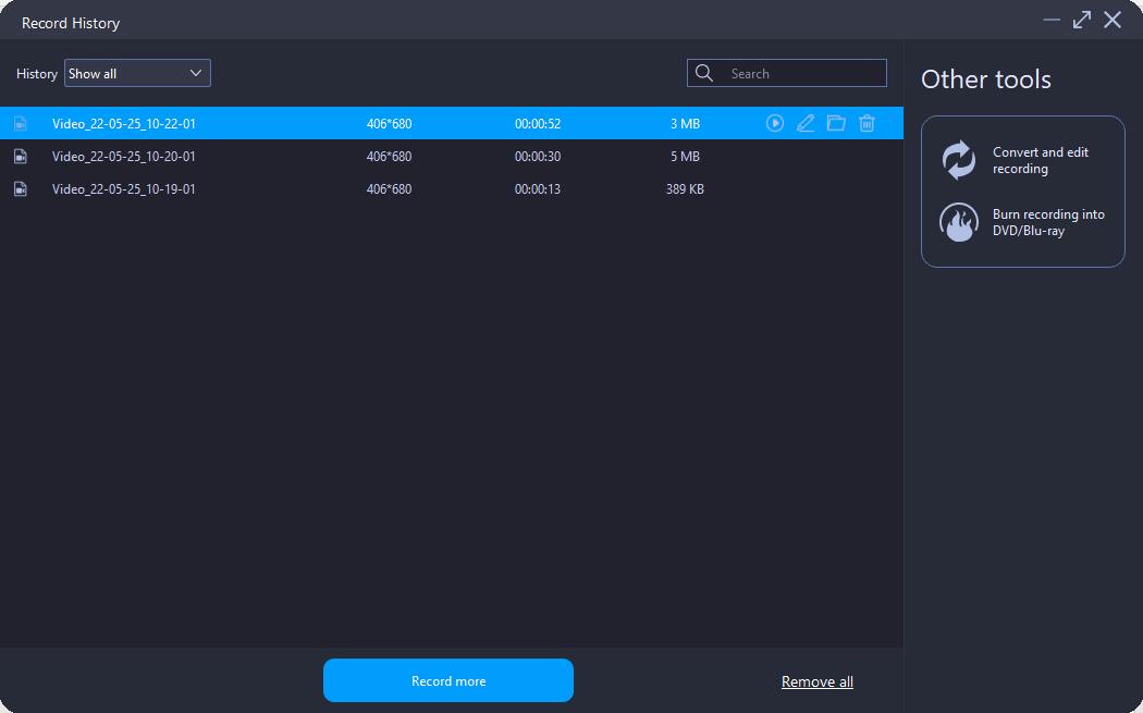 When the screen recording process is complete, click the “Stop” button to stop recording. Then, all recordings will be listed in the Record History panel. The name, dimension (if available), duration (if available), and size of the recordings will be available.
