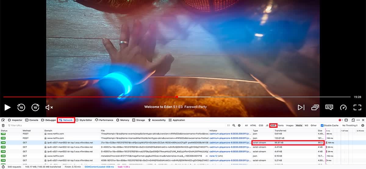 Firefox developers have developed a feature that allows you to download subtitles directly in the browser, so we can extract Netflix subtitles directly on Firefox. Play Netflix videos online in the Firefox browser. Then, right-click the mouse in the Netflix video to display the “Developer” window and select the “Network” option. Then, click the “XHR” option and the “octet-stream” option in sequence. Finally, select “Open in a new tab”. At this point, Firefox will automatically download a .dms file. Note: This .dms file is not a subtitle file, so it cannot be added directly to the video. You also need to convert it into a subtitle file before you can add subtitles to the movie.