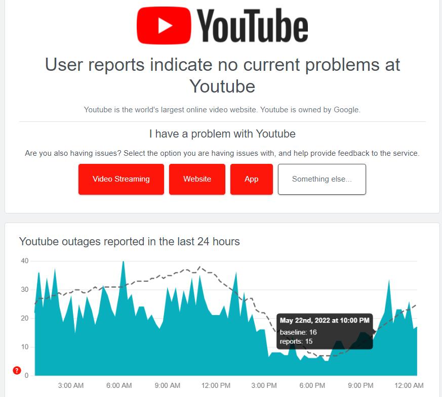 In most cases, YouTube slow may be caused by an offline or overloaded YouTube server. To verify this, you can use third-party sites like Downdetector to check the current status of YouTube’s servers. It also displays the problems that YouTube has encountered for the last 24 hours.