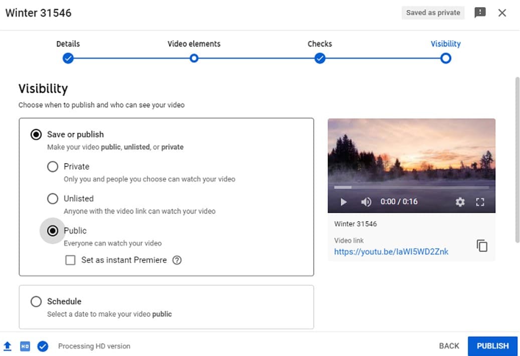 Step 3: After the video is uploaded to the platform successfully, you will be able to find a video link beneath the video. Thus, you can copy the video URL and save it for later usage. If you desire to post the video on YouTube channels, you can also click on the “PUBLISH” icon to make it.