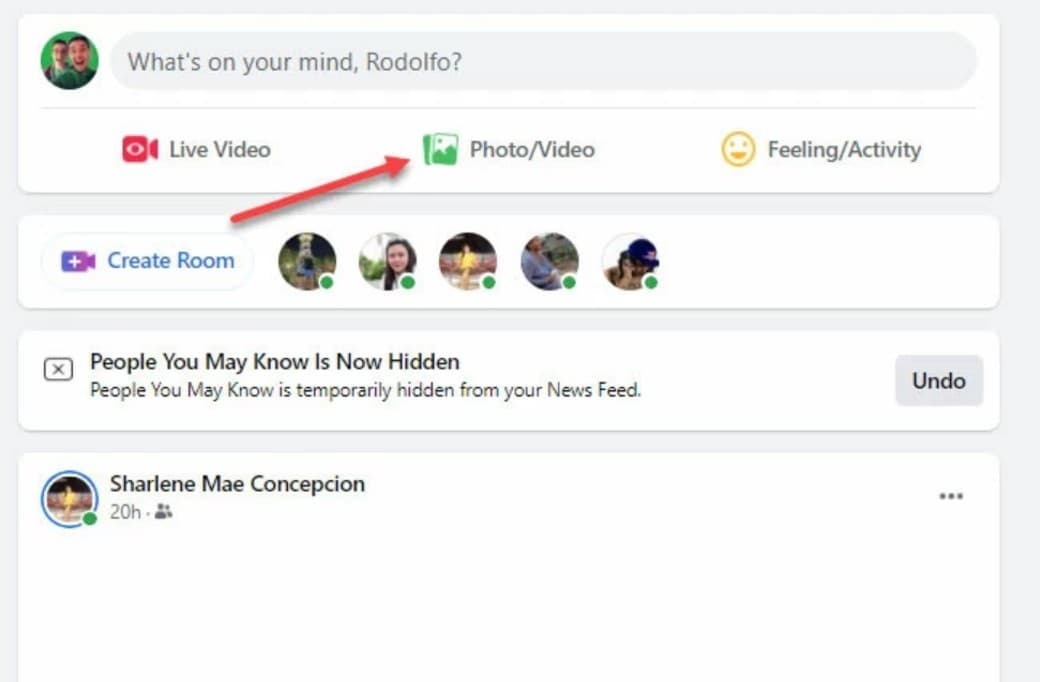- Hit on the button of “What’s on your mind, [Name]?” in the top of your News Feed and then hit on the button of “Photo/Video” in green in the “Add” to your post box.