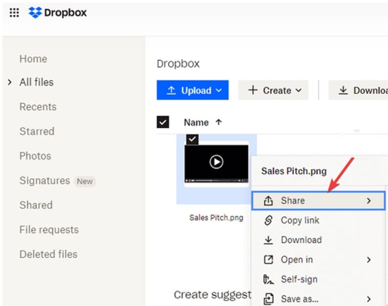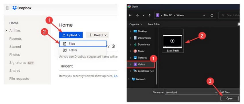 Step 1: Go to Dropbox and sign in it with your own account. Here you need to click on the “Upload” button to open the video file directory to choose the video you desire to upload to the tool.
