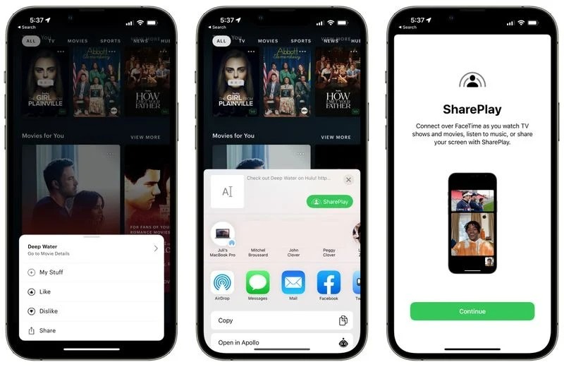 During a SharePlay session, users can stream most shows and movies included in Hulu’s streaming library. To use SharePlay, people have to get a Hulu subscription, a supported iPhone, iPad or Apple TV device running iOS or tvOS 15.1 or later, and Hulu app downloaded and installed to the devices and signed in. To start Hulu SharePlay, people must firstly start a Facetime call and then kick off Hulu app to play back target Hulu video.