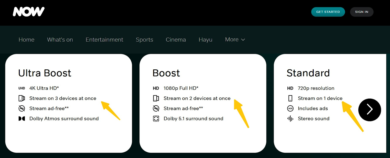 Like all other platforms, there are simultaneous stream limits for Now also. On the base tier, you can watch on one device at a time in 720p. On the Boost package, you will get it on two devices, and you will get 1080p picture quality with Dolby 5.1. This package removes ads from on-demand content. Moving on, Ultra Boost will give you simultaneous stream limits on 3 devices. Also, you will get 4K HDR, Atmos support, and noticeably smoother motion on some sports channels. Also, your download will stay on your device for up to 30 days. But once you play it for the 1st time, you will have a 48-hour window. You can also see details of all 3 tiers in the image below.