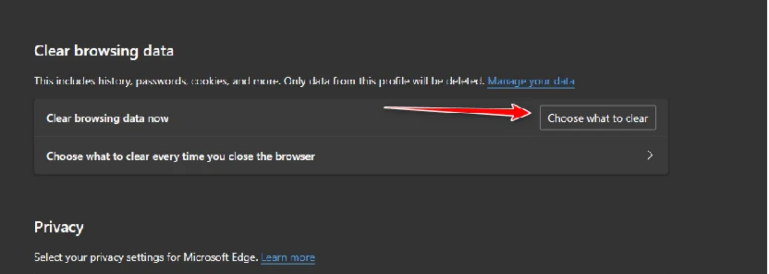 Step2: Go to Privacy, Search, and Services on the Settings screen. There, click on the "Choose what to clear" button next to "Clear browsing data now." Pick "All time" from the list of time ranges.