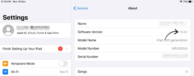 Step 2: Choose the tab of “About” to see your iPad version number that is listed next to the “Version” menu. You can also check the model name and model number via this panel.