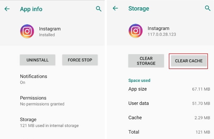 For Android: As Instagram videos not playing on Android, go to Settings > Apps > Instagram. Then you can select Storage, tap Clear Cache to make it. Finally restart your phone to check Instagram app.