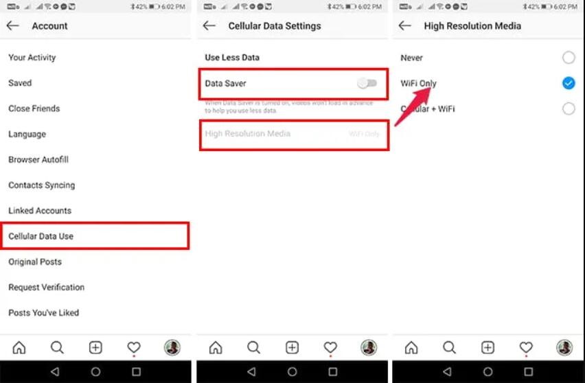 - Go Account > Cellular Data Settings, then toggle on Data Saver. Now you are required to tap High-Resolution Media and choose your preference.