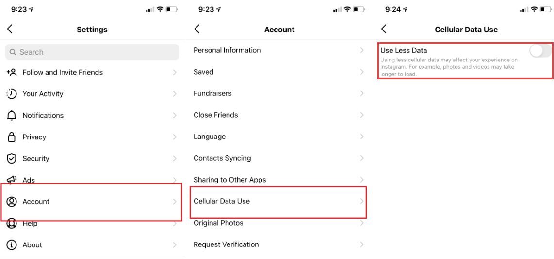 - Select Cellular Data Use, then enable Use Less Data. This will prevent Instagram videos from pre-loading.