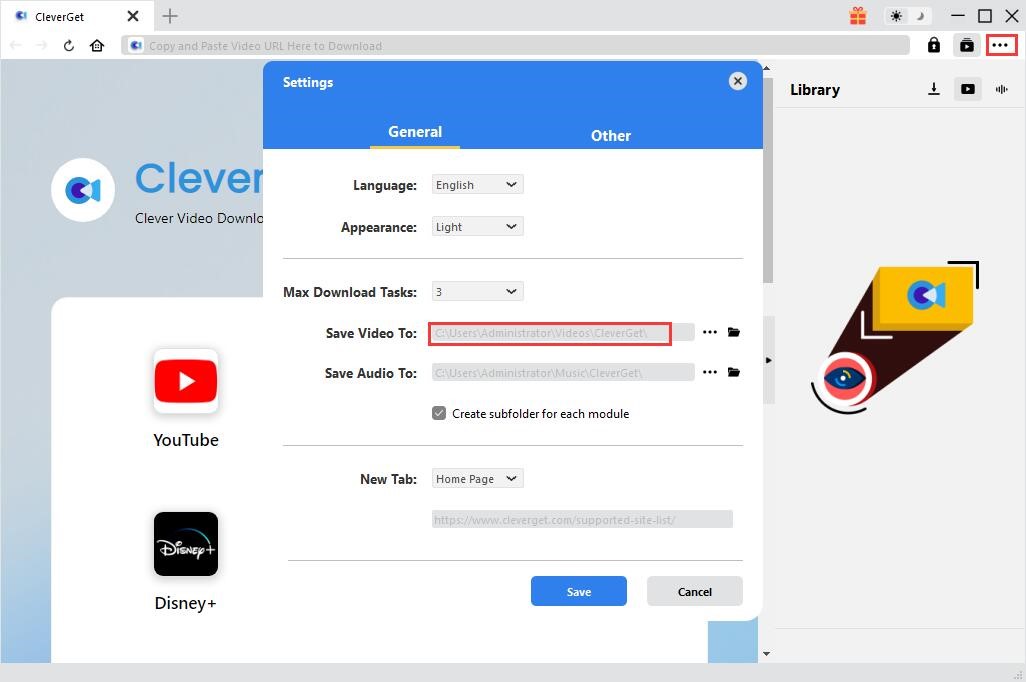 After downloading and installing CleverGet on your computer, you can launch it and make some proper settings, such as the output directory to save the video/audio files, language, Max Download tasks, etc., if necessary.