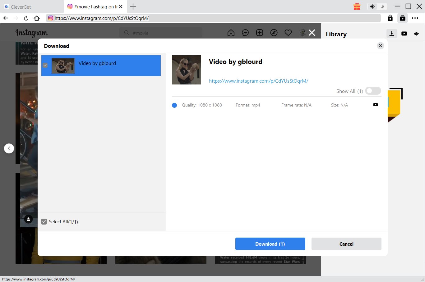 When the Instagram video is playing, CleverGet will automatically detect the available video sources to download and list all the downloadable options on the pop-up Download panel. You can select the video option you want to download and click Download option to start downloading.