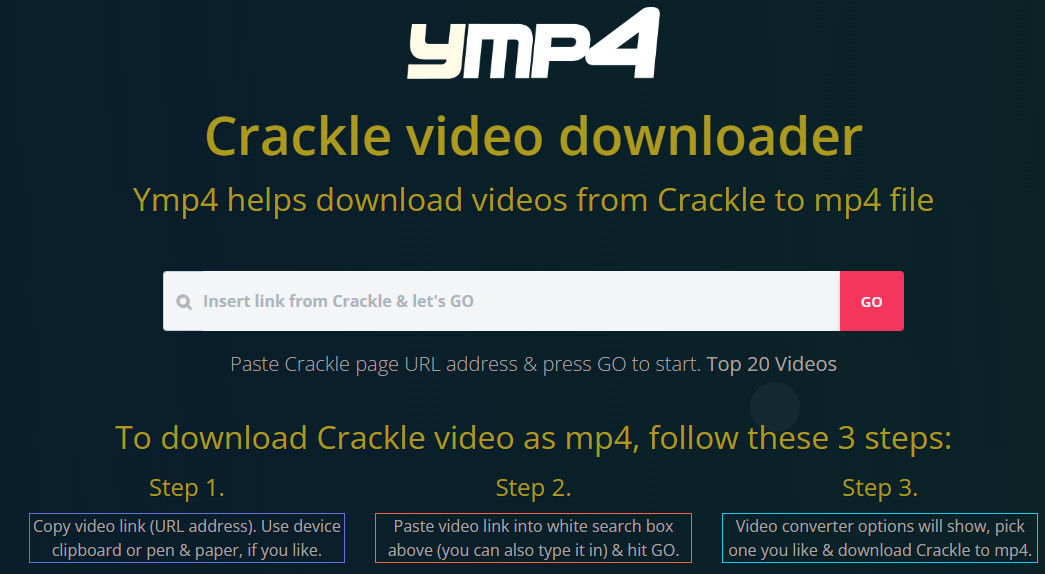YMP4 is Crackle video downloader online. And it’s really one of the best Crackle video downloaders. YMP4 will help you download videos from Crackle and save them for offline access. Crackle video downloader. Ymp4 can help save Crackle as MP4 & MP3 file on your device. No signup, free, unlimited downloads from Crackle.