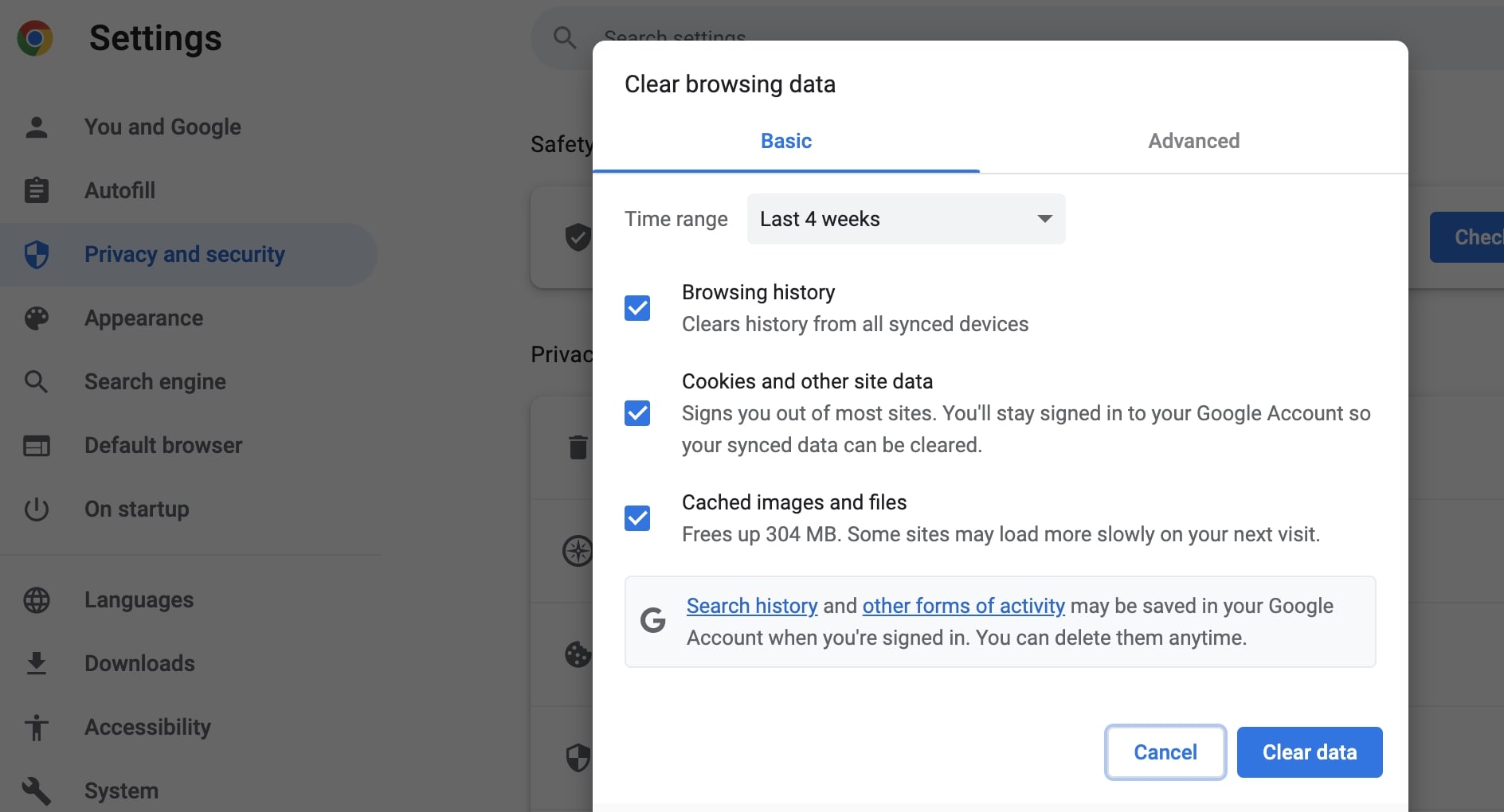 Step 3: Click “Clear Data” to clear the cache on Google.