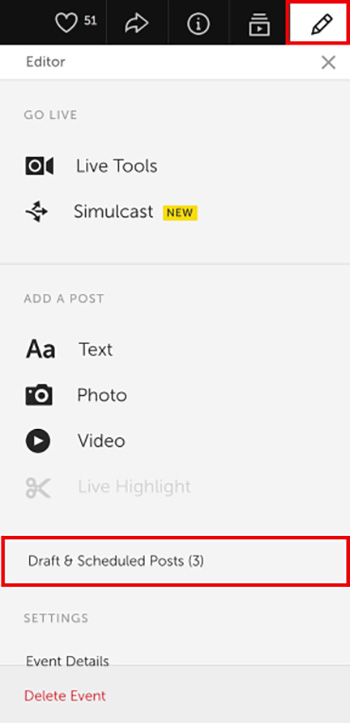 Step 1: Go to your event page and click on the Editor icon. Then choose “Draft & Pending Posts” to see all the posts available.