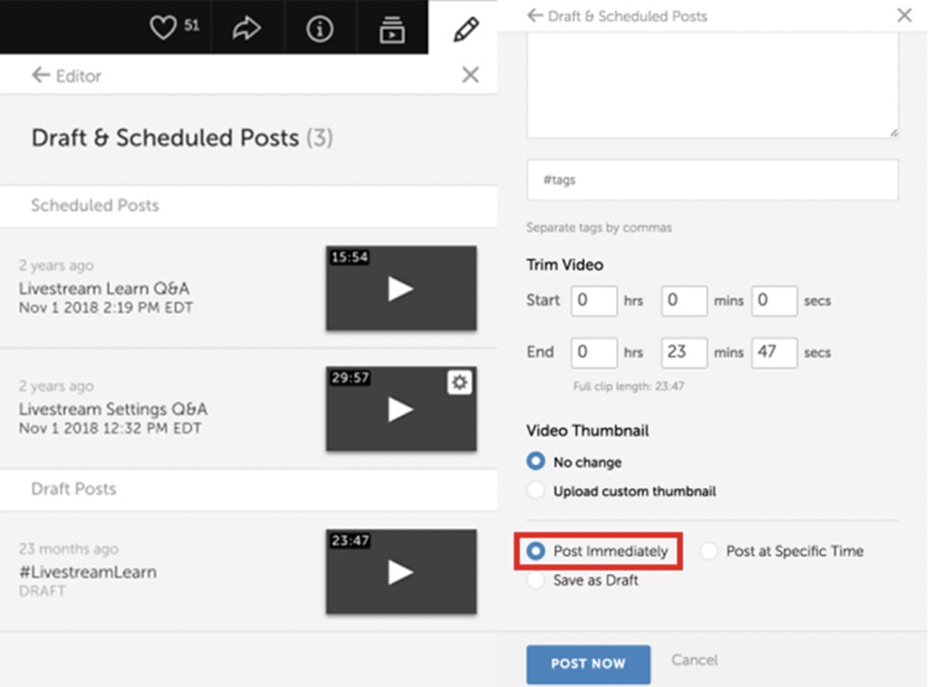 Step 3: Scroll down the page and select “Publish Immediately.” Click on the “Post Now” button to publish the stream. Now your VODs should be visible on your channel.