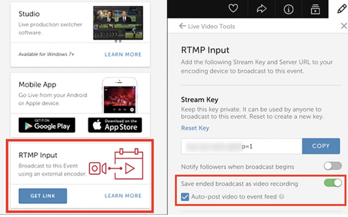 Step 2: Switch on the toggle for the “Save ended broadcast as video recording” and tick “Auto-post video to event feed” so your VODs will be published to your event page.