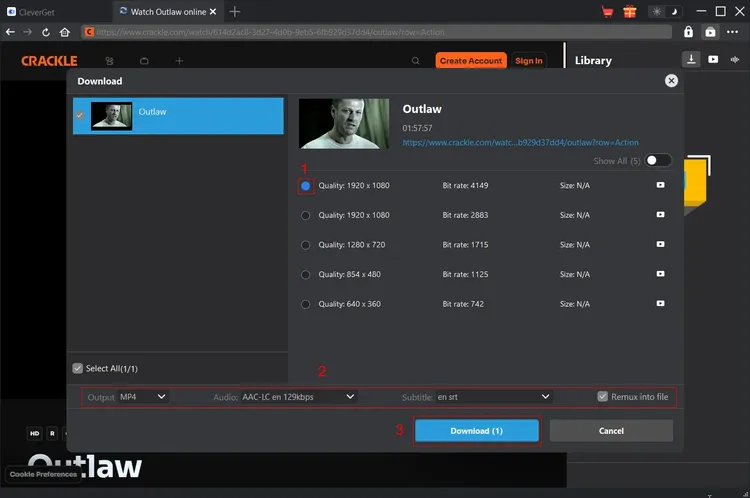 at the bottom right corner to let CleverGet FOD Downloader parse video URL. There will pop up a “Download” interface. On the “Download” interface, video download options are listed in different quality/resolution, frame rates and sizes. Choose the one you want to download, decide output format, select subtitles and audio tracks. Finally, click the blue “Download” button to start downloading Crackle movies or TV series.