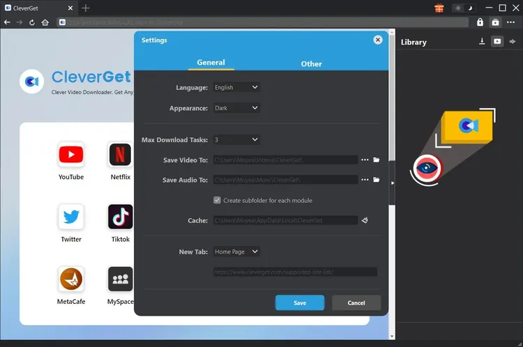 CleverGet is user-oriented and there are abundant settings for facilitating operation and improving user experience. Users can click three-dot icon at the top-right corner to look for "Settings" option on the drop-down panel to enter "Settings" window. After all settings are finished, click "Save" to save all changes.