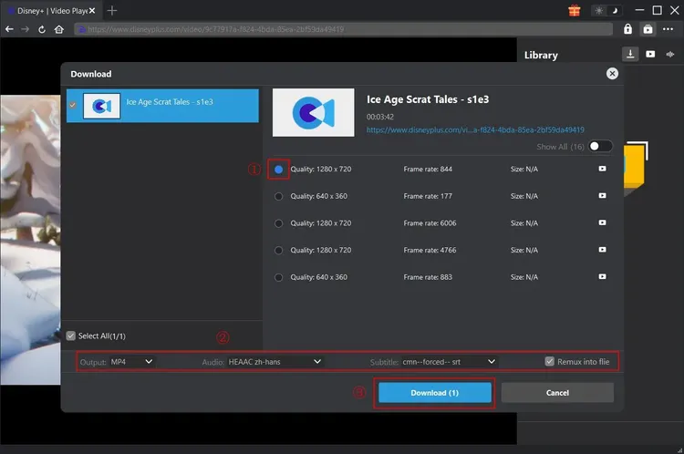 at the bottom right corner to let CleverGet Disney Plus Downloader parse the video URL. If CleverGet Disney Plus Downloader successfully parses the video, it will pop up a "Download" interface with all available download options listed in different quality/resolution, frame rates and sizes. Below the video result panel, you could see options for Output, Audio Tracks and Subtitles setting. Select the video, audio tracks, subtitles and output format, and decide whether or not to remux subtitles into output video. And then click "Download" button to start downloading Disney Plus series/movies.