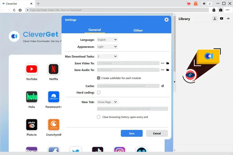 CleverGet offers default settings for online video downloading, but allows you to change the directory. On CleverGet program, click the three-dot icon and then click "Settings" option to open "Settings" panel. Under "General" tab, you can set output directory in the "Save Video To" box, change other settings like program UI language, appearance, max download tasks, etc. Checking "Create subfolder for each module" option will save online videos in sub-folder of corresponding modules. Finally, click "Save" button.