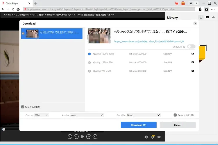 Once you have started playing back the target FANZA video, there will be a download icon at the bottom right corner, by clicking which you could let CleverGet FANZA Downloader parse the video URL. If CleverGet FANZA Downloader successfully parses the video, it will pop up a "Download" interface with all available download options in different quality/resolution, frame rates and sizes. Choose the one you want to download, decide the output format, subtitle and audio track if available in independent file, and then click the blue "Download" button to start downloading FANZA videos.