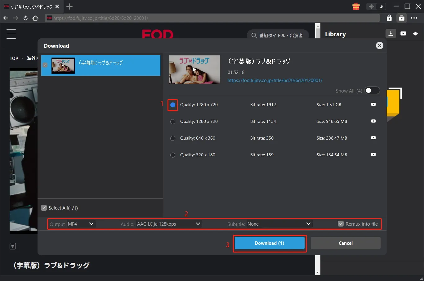 Once you have entered the playback page of target FOD video, click the download icon at the bottom right corner to let CleverGet FOD Downloader start parsing target FOD video page. When the parse completes, there will pop up a “Download” interface that list all available download options in different quality/resolutions, bit rates and sizes, subtitles and audio tracks. Choose the one you want to download, and then decide output format, audio tracks and subtitles. Afterwards, click the bottom blue “Download” button to start downloading FOD videos.