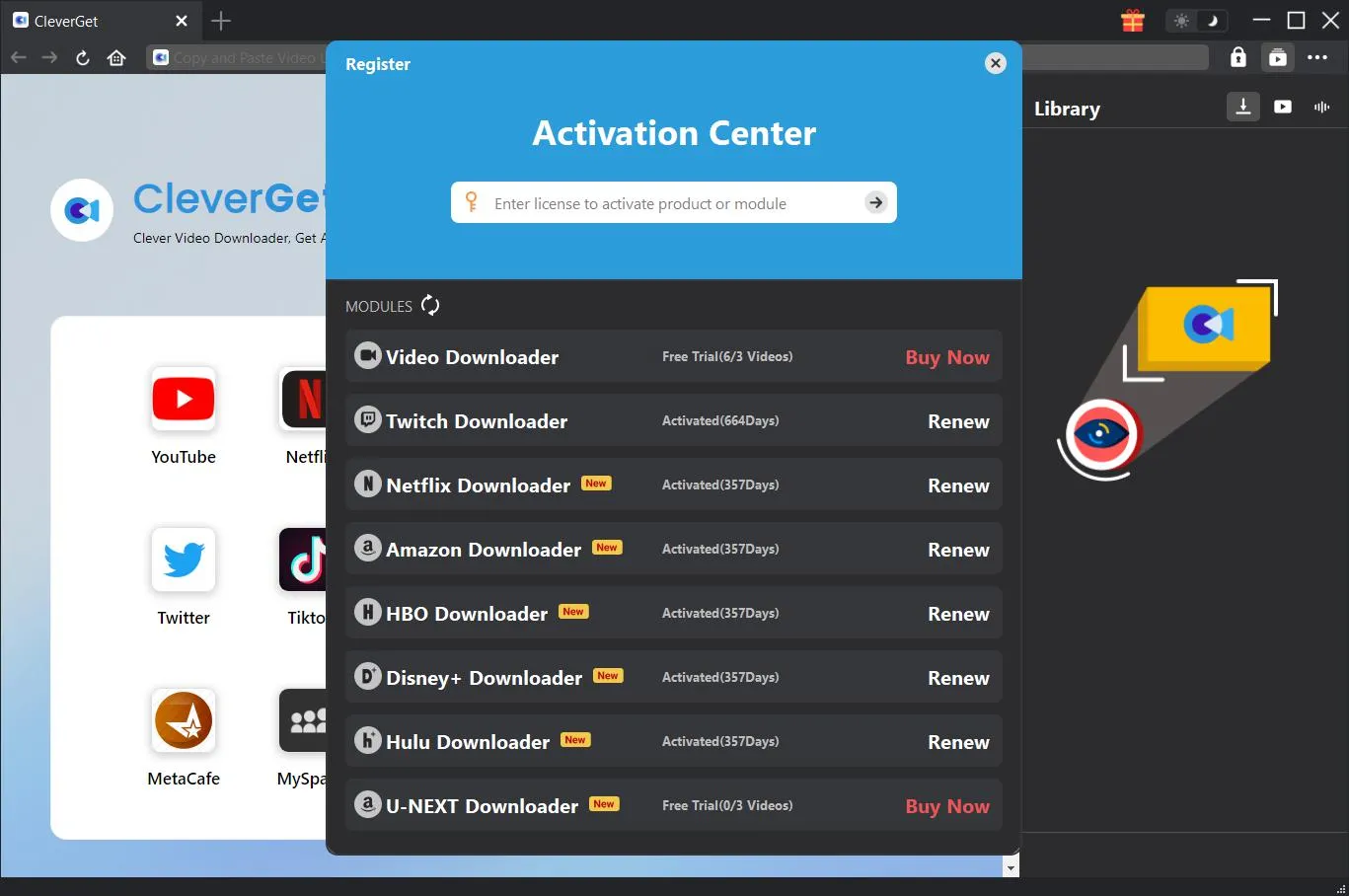 C. On CleverGet program, click the "Activate" button to enter "Activation Center" interface. Click the "Buy Now" button next to the module you want. After that, you will arrive at the purchase page of CleverGet, where you can purchase the registration code of any module you want.