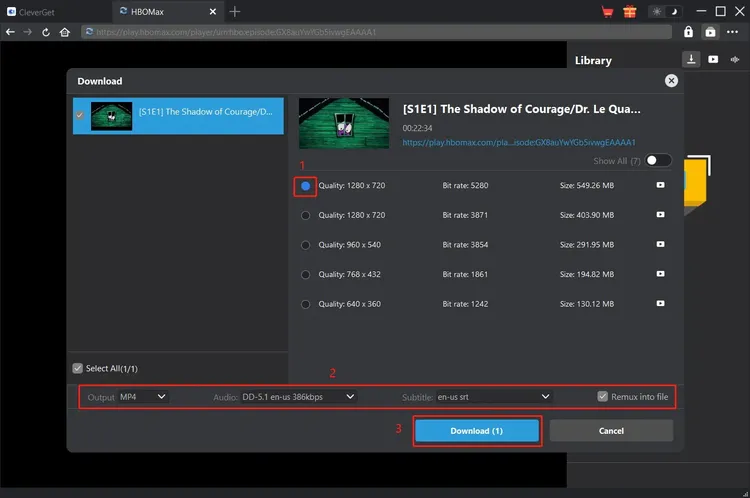 at the bottom right corner, by clicking which you could let CleverGet HBO Max Downloader parse the video URL. If CleverGet HBO Max Downloader successfully parses the video, it will pop up a "Download" interface with all available download options listed in different quality/resolution, frame rates and sizes. Choose the one you want to download. Also, you could set Output, Audio Tracks and Subtitles below. And then click "Download" button to start downloading HBO movie/show.