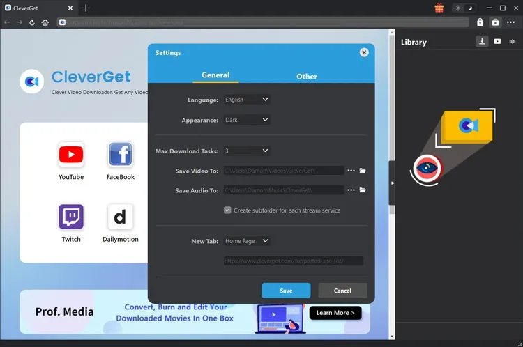 In the "General" tap, you can find almost all basic settings for CleverGet, including:
